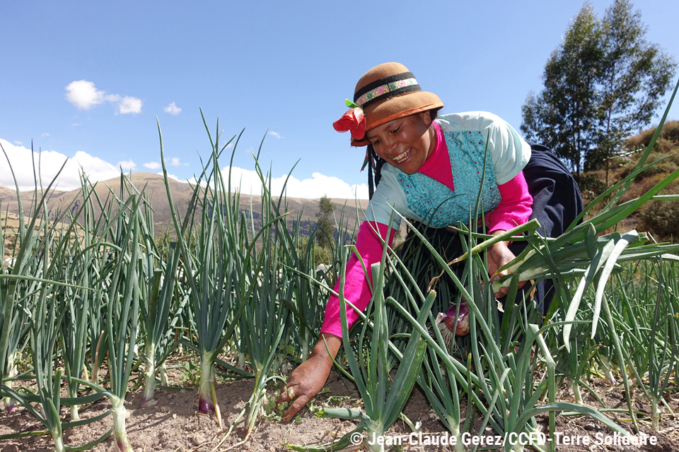 Nilda, productrice d’oignons dans son champ, Reportage sur l’accompagnement de la communaute d’Asacasi dans le developpement de l’artisanat comme alternative a la mine, de l’association peruvienne CooperAccion, partenaire du CCFD-Terre Solidaire